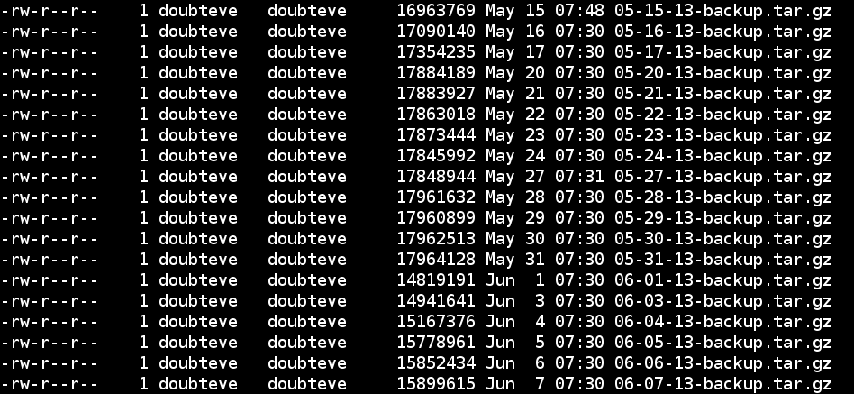 Here's the daily backup (Except for on Saturday and Sundays) dumping archives to my FTP server.